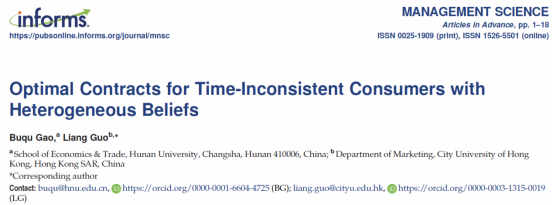 高步渠助理教授与香港城市大学郭亮教授合作的研究成果以“Optimal Contracts for Time-Inconsistent Consumers with Heterogeneous Beliefs”为题在管理学国际顶尖期刊Management Science发表。Management Science期刊创办于1954年,由美国运筹学与管理学学会主办,是管理学、运筹学领域的顶级期刊。该期刊是美国德克萨斯大学达拉斯分校遴选的24本商学院顶级学术期刊之一(简称UTD 24),以及英国《金融时报》评定出的50本商学院顶级期刊之一(简称FT 50)。