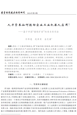 许和连教授、博士生赵泽昊、博士毕业生金友森合作撰写的学术论文《人力资本如何驱动企业工业机器人应用?——基于中国“高校扩招”的准自然实验》在《数量经济技术经济研究》2024年第9期刊出。《数量经济技术经济研究》期刊是由中国社会科学院数量经济与技术经济研究所所主办的重要学术期刊。