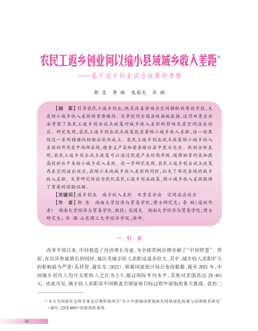改革开放以来,中国创造了经济增长奇迹,为全球贫困治理贡献了"中国智慧"。然而,在经济快速增长的同时,地区及城乡收入差距也逐步拉大。其中,城乡收入差距扩大的影响最为严重。在此背景下,国家层面先后出台了多个文件为如何缩小城乡收入差距并推动共同富裕指明了方向。需要指出的是,中国劳动力总量丰富,但仍存在大量农村劳动力"背井离乡",劳动力资源布局和市场分割问题突出。在此背景下,为适应新型城镇化发展要求,推动农村农民共同富裕、乡村振兴和农业农村现代化,国家发展和改革委员会、农业农村部等十部委于2016年2月、12月和2017年10月分别批复设立了90、116和135个农民工返乡创业试点地区。那么,返乡创业试点政策作为近年来新型城镇化建设中实施的旨在支持农民工等人员返乡创业的一项代表性政策,能否助力缩小城乡收入差距?其内在机制是什么?是否存在空间溢出效应?这些问题是有待深入研究的重要议题。