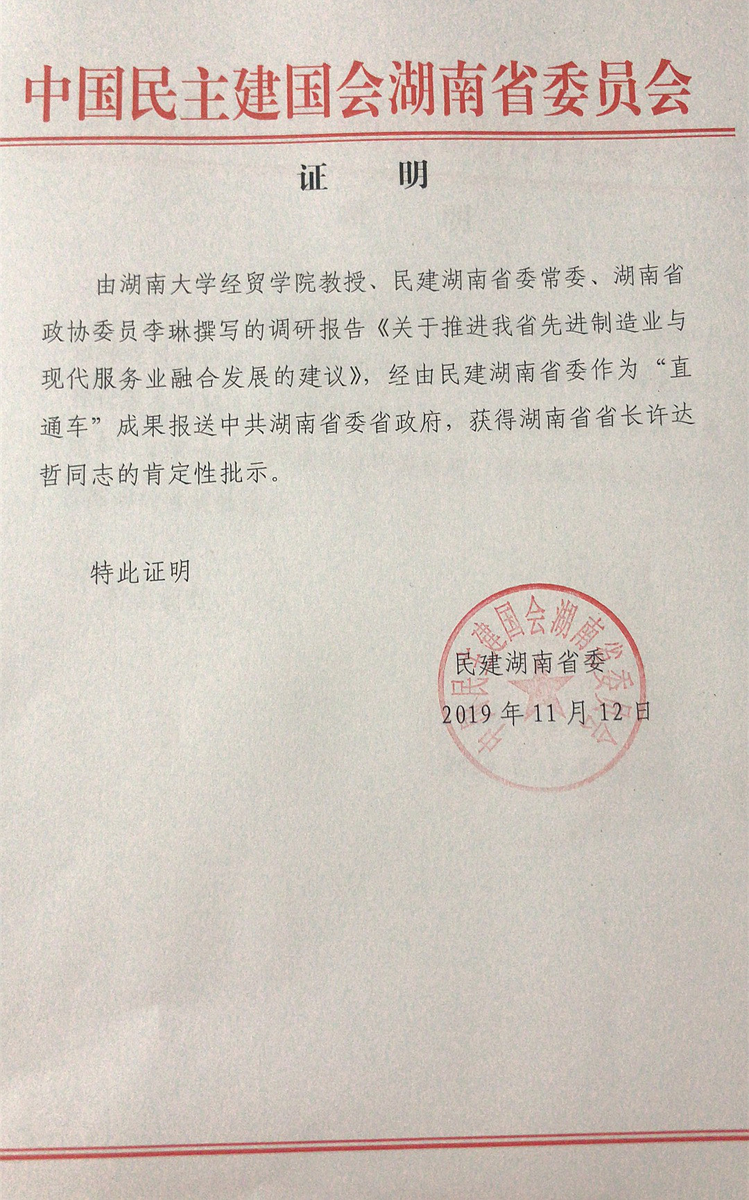 据民建省委确认,由 tasexy 经贸学院教授、民建湖南省委常委、湖南省政协委员李琳撰写的调研报告《关于推进我省先进制造业与现代服务业融合发展的建议》,经由民建湖南省委作为“直通车”成果报送中共湖南省委省政府,获得湖南省省长许达哲同志的肯定性批示。