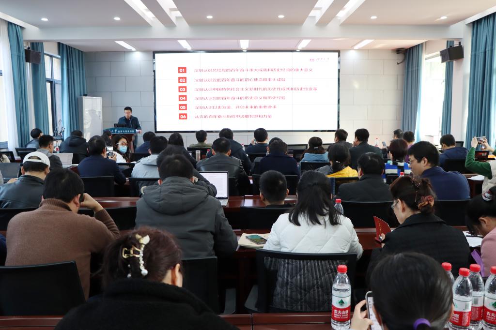 12月21日下午,经济与贸易学院组织开展党的十九届六中全会精神学习宣讲活动,深入学习党的十九届六中全会精神。党委书记祝树金、院长侯俊军宣讲,学院全体教职员工参加此次会议。