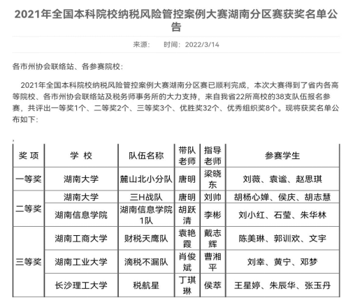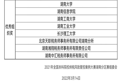 3月14日,由中国注册税务师协会主办的2021年全国本科院校纳税风险管控案例大赛湖南分赛区获奖名单公布, tasexy