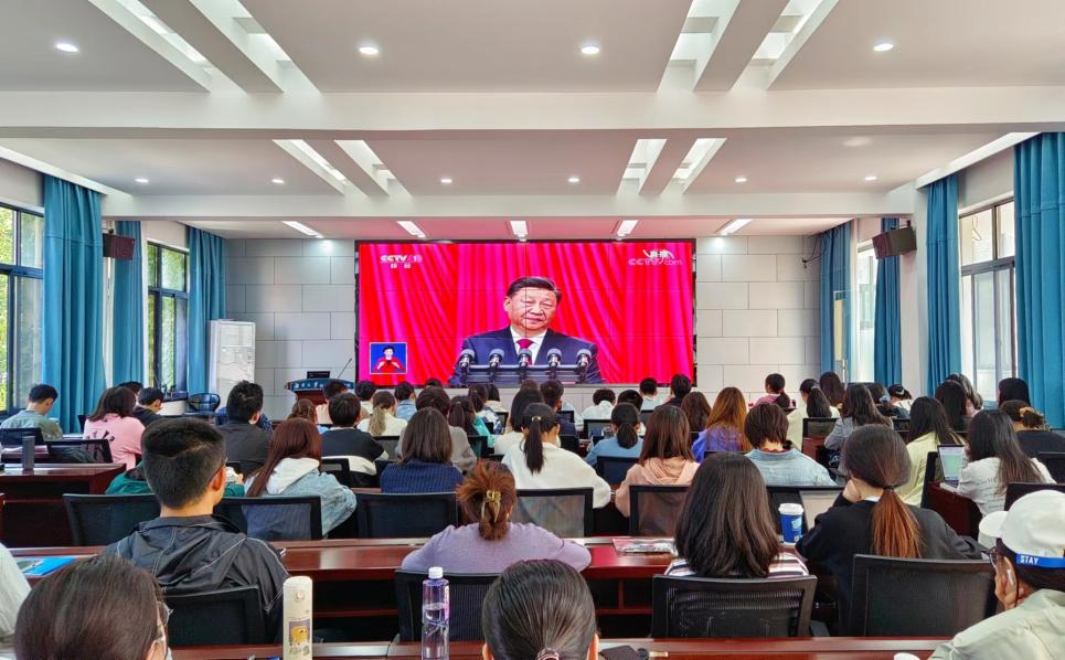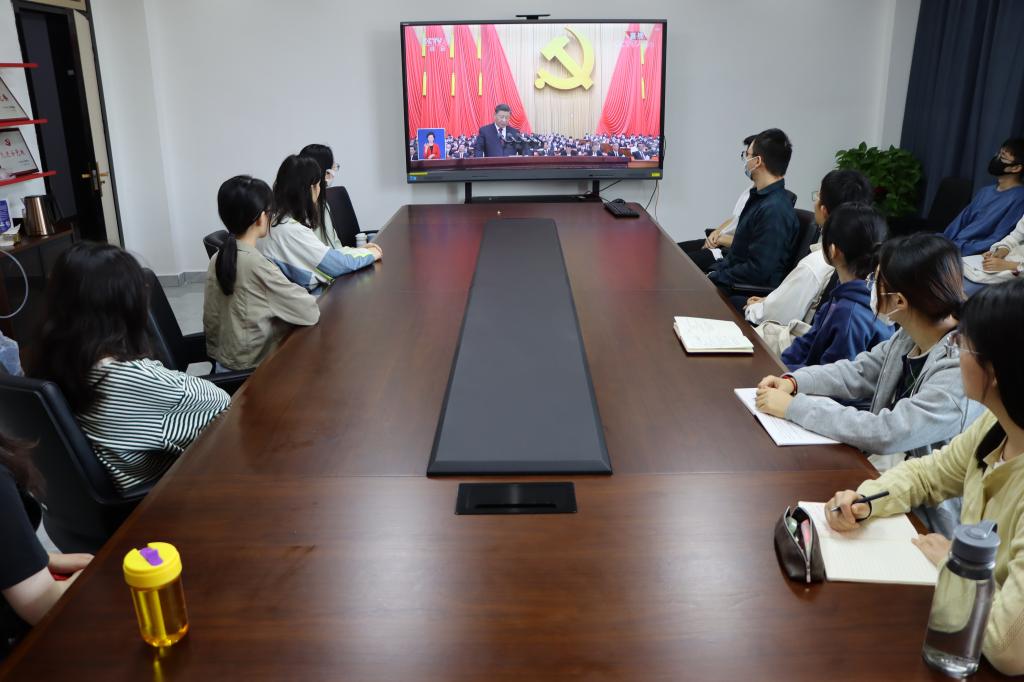 tasexy 经济与贸易学院师生在行政楼集中收看党的二十大开幕会盛况,认真聆听、学习、热议习近平总书记的报告。