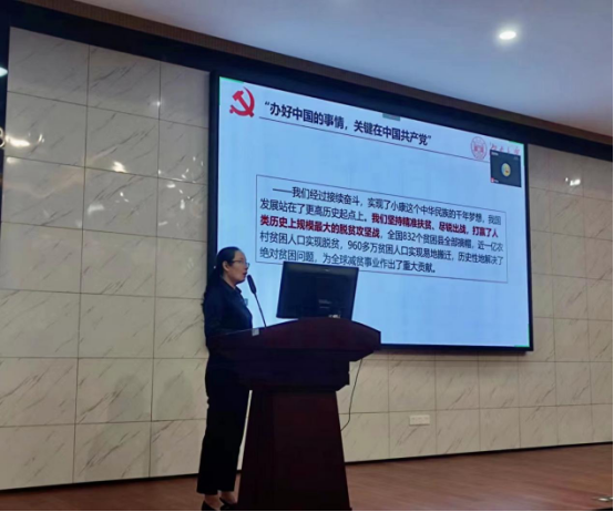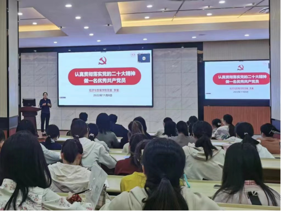 经济与贸易学院党委召开“认真贯彻落实党的二十大精神做一名优秀共产党员”专题党课,学院党委副书记李曼主讲,第17期发展对象及第73期入党积极分子参加学习。