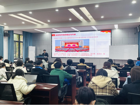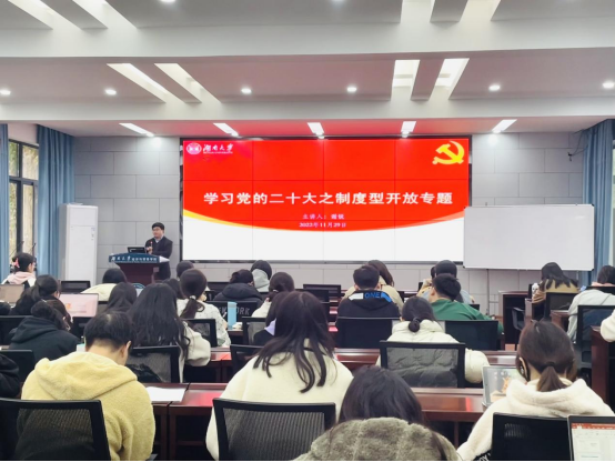 经济与贸易学院党委召开“学习党的二十大精神之稳步扩大制度型开放”专题党课,学院党委委员、学院副院长谢锐主讲,第73期入党积极分子同学参加本次党课。