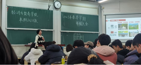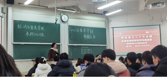 2023年2月14日,经济与贸易学院本科2020级于二教301教室举行“青春践行二十大”年级大会。会议由辅导员蔡婕萍老师主讲,围绕贯彻落实党的二十大精神,开展生涯发展规划专题,辅导员曾婧老师、本科2020级全体同学参加。
