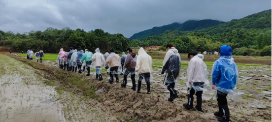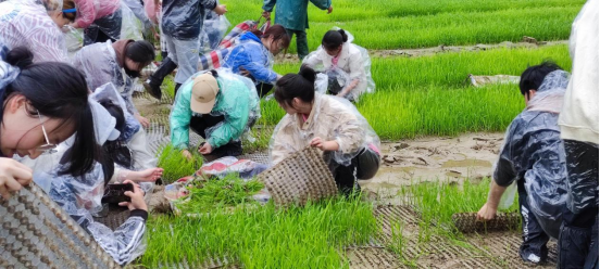 座谈会后,经贸学院师生深入田间地头,实际体验春耕。当地村民为同学们详细介绍了再生稻的优势,分享了育秧、插秧、田间管理、成熟的过程,演示了插秧基本动作,在村民的指引下,师生协作分组作业,共同完成了分苗、运苗、抛秧的春季耕种全流程。