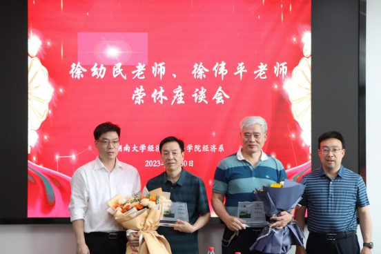 5月30日下午,经济与贸易学院在经贸大楼615会议室举行教职工荣休欢送会议,欢送徐幼民、徐伟平两位老师光荣退休。学院领导班子、经济系老师参加欢送会。会议由经济系党支部书记曲丹主持。