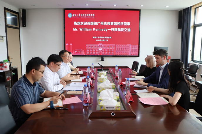 5月31日,英国驻广州总领事馆经济领事柯望舒一行来访,学院院长侯俊军,副院长肖皓,国际合作与交流处副处长周健、处办主任刘蕾参加座谈。