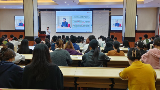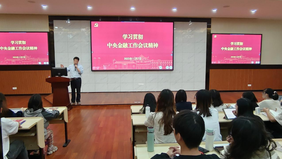 经济与贸易学院党委在财院校区老食堂二楼大报告厅召开“学习贯彻中央金融工作会议精神”专题党课。学院院长、党委委员侯俊军教授主讲,第19期发展对象和第75期入党积极分子参加党课。院学工办主任蔡婕萍主持。