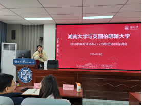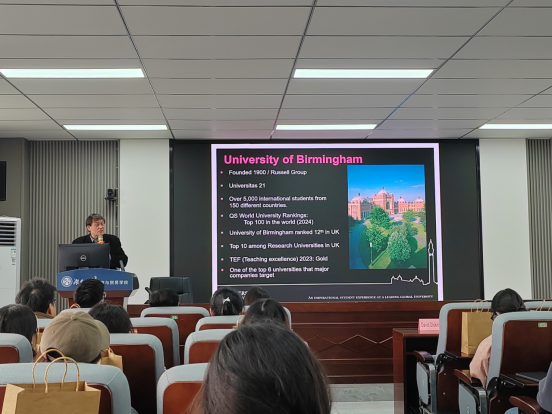 3月6日,英国伯明翰大学商学院国际化事务负责人David Dickinson教授来校就经济学类本科双学位项目进行宣讲。Dickinson教授、学校国际合作与交流处罗卓娃老师、项目中方联络人经济与贸易学院蒯文婧老师先后就伯明翰大学基本情况、项目设置、申请和选派流程、学校奖学金制度等进行介绍。会议由罗卓娃老师主持,经济与贸易学院副院长徐航天、金融与统计学院副院长李海奇等多位老师及本科生50余人参与。