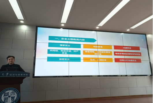 辅导员艾克帕尔围绕国家安全教育、初级火灾处置技能、高层建筑火灾逃生技能、交通安全、电动车驾驶及电池使用规范、宿舍用电安全、春季心理安全、防范网络诈骗电信诈骗、法制安全等方面详细传达了学院“安全教育周”工作方案。