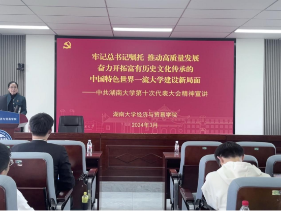 第十次党代会精神宣讲,她通过对党代会报告的生动解读,让同学们对学校与学院有了更深入的认知,也让同学们深刻理解作为湖大人的使命。她希望同学们能够在思想和行动上,切实向党组织靠拢,要志存高远、奋斗自强、抓住机遇、练就本领,成为一个学有所用的人。