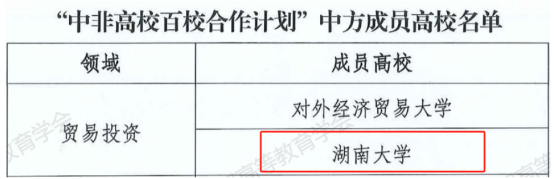 入选“贸易投资”领域(全国仅2所)。相关项目由中非经贸合作研究院牵头,汇聚经济与贸易学院、公共管理学院、工商管理学院、法学院等相关力量,紧扣湖南省承担深化中非经贸合作的国家战略任务,立足中非经贸博览会、中非深度合作先行区国家平台,充分发挥国际贸易学国家重点学科等学科优势,与非洲高校、相关政府部门与企事业单位开展合作。