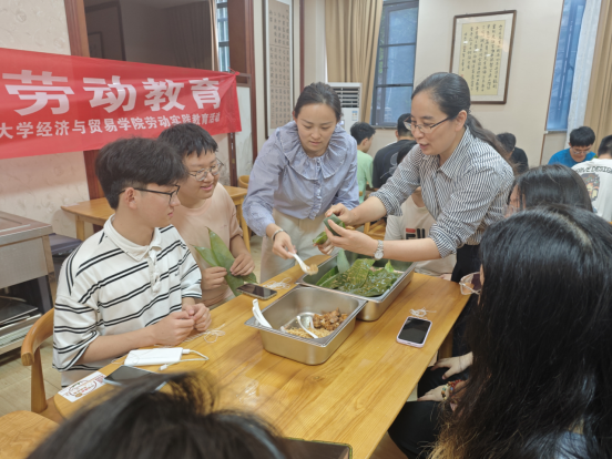 在绿意盎然的初夏时节,金粽飘香。在端午节来临之际,为传承中华优秀传统文化,弘扬爱国精神,激发学生劳动的热情,2024年6月6日下午,经济与贸易学院联合后勤保障部在求是楼食堂开展“传承传统文化,加强劳动实践”主题劳动实践教育活动。学院党委副书记李曼、辅导员、班主任、食堂工作人员以及五十余名学生参与,师生共同体验粽子的制作过程、感受传统节日文化的魅力。
