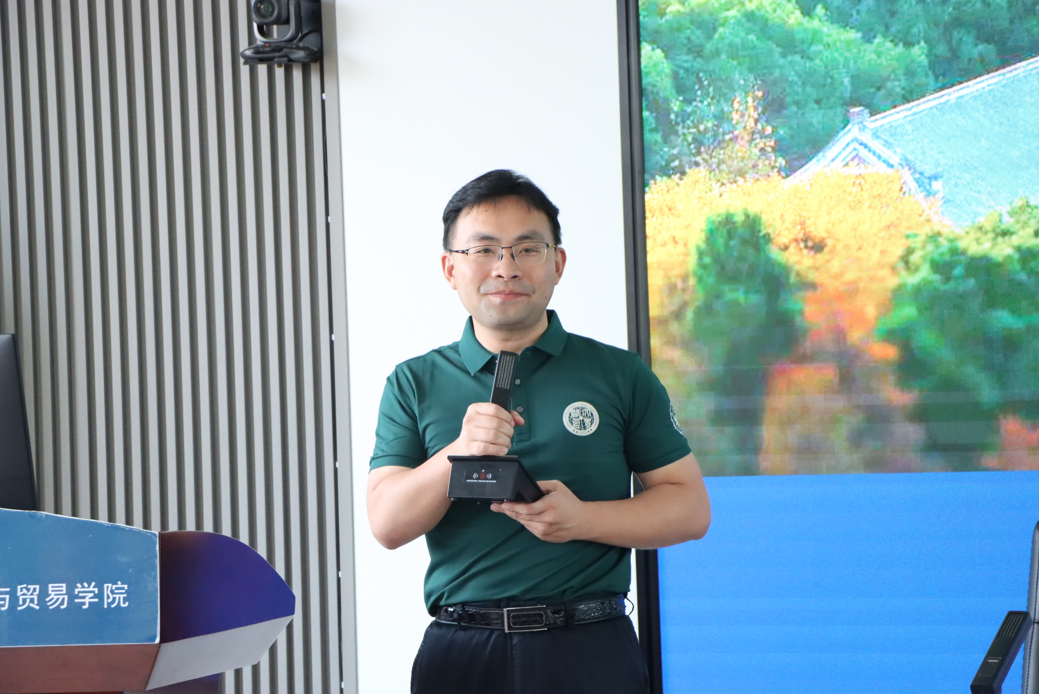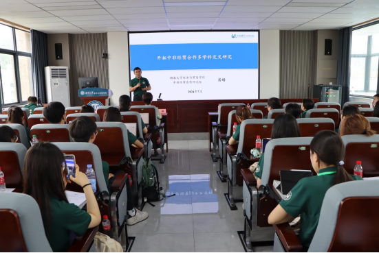 学院副院长、中非经贸合作研究院执行秘书长肖皓教授以“开拓中非经贸合作多学科交叉研究”为主题,详细介绍了非洲的发展趋势及其在全球经济中的重要地位,阐述了推动中非关系向更深层次、更广领域合作的意义,并鼓励同学们积极参与中非经贸合作研究,为促进国际经贸合作贡献力量。