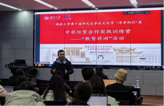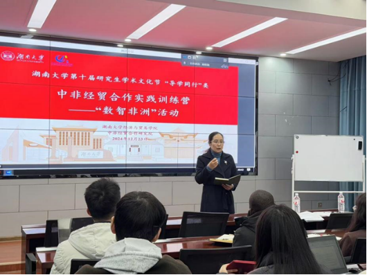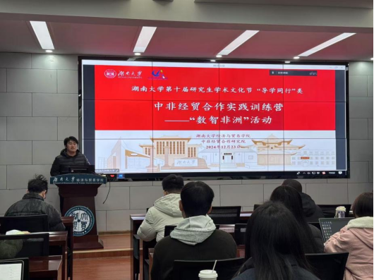 第十届研究生学术文化节——“中非经贸合作实践训练营”的内容之一。活动邀请了非洲研究院常务副院长肖皓教授、经济与贸易学院党委副书记李曼出席,支部书记李青洲博士生和叶新健博士主持活动。此次活动由经济与贸易学院主办、研究生导师团队第5支部承办。