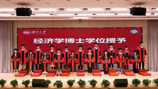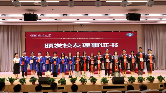 学院党委书记邓利华宣读《经济与贸易学院关于2025届本科生、硕士研究生、博士研究生授予学位的决定》,全体2025届毕业生们依次上台,从老师们手中接过学位证书,庄重地接受学位授予。经济与贸易学院院长祝树金为省优秀毕业生颁发证书,学院党委书记邓利华为2025届校友理事颁发证书。