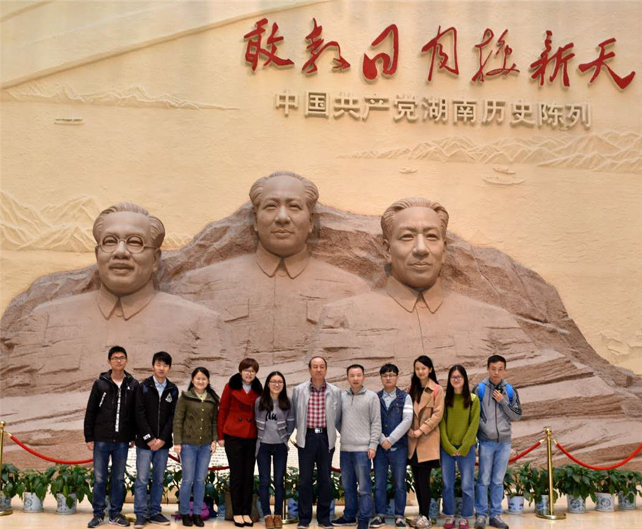 紧接着,在党史陈列馆工作人员的带领和解说下,老师和学生们有序的进入各个展馆,认真聆听讲解,参观其中的图片、文物、场景。整个参观过程有四个部分,前三部分按照历史发展脉络,分别以“开辟新天地”、“描绘新画卷”、“谱写新篇章”为题,展示新民主主义革命、全面建设社会主义、改革开放三个历史时期湖南的生动实践;第四部分以“三湘群英谱”为专题,主要介绍以毛泽东为代表的湘籍和长期在湘工作的著名党史人物。大家边走边看,透过生动形象的图片、文物和场景陈列,更详尽的了解了湖南党史的脉络和细节,对党史也有了更深刻的领悟和认识,可以说这是一部我们‘走着读’的湖南党史。参观完党史陈列馆的全部内容,大家仍显出意犹未尽的感觉,感叹历代党员为党的建设作出的巨大贡献,为社会主义事业献身的高尚品质。最后,为纪念这次充满意义的党史陈列馆之旅,我们在陈列馆和展厅背景墙前进行了留影纪念。