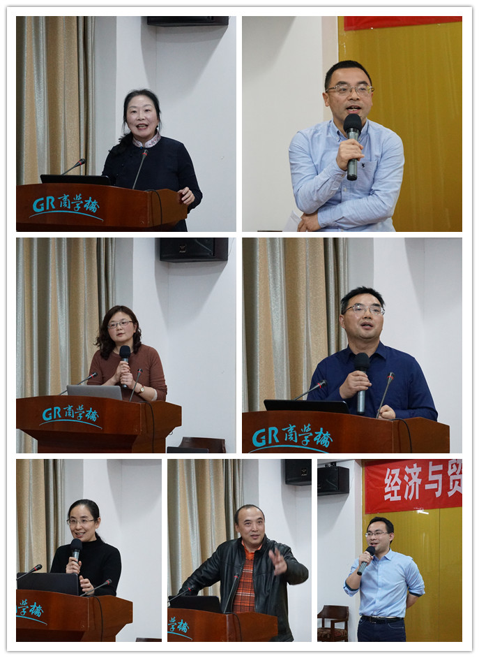 接下来,国贸系主任钱晓英、财政学系主任谭光荣、经济学系主任刘志忠,国贸系书记莫莎、教师代表罗宏斌、双创中心主任李曼、院长助理肖皓分别从课堂教学、培养方案、教学模式、现代技术在课堂的运用、督导与评价的促进作用、提高学生创新创业能力和成果以及如何从理论学习向知识应用转化等方面报告了自己的看法。