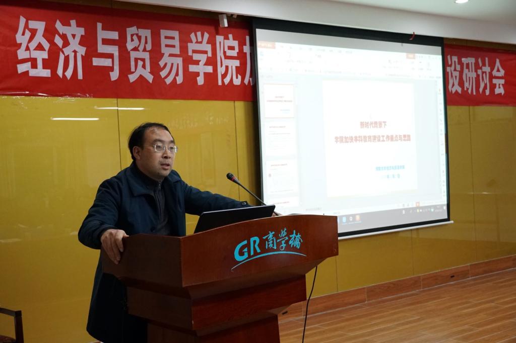 副校长谢赤教授、教务处长王文格教授出席,经贸学院全体教职员工共计80余人到场参与讨论。会议由经贸学院党委书记郭平教授主持。