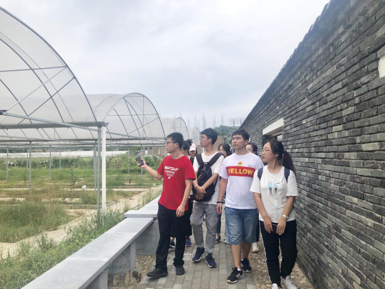 团队在苏阳村大学生村官陈庭的带领下,前往苏阳村农产品种植园区进行参观,其中葡萄产业园引进了大量的大棚种植技术,漫山山间及山脚下展现出一片片大棚海洋。为了探索与尝试“农业+旅游”的新模式,产业园在葡萄种植基地搭建了观赏性的长廊与看台,农业向第三产业延伸的雏形近在眼前。经过学习了解到,苏阳村葡萄借鉴了象环村的发展模式,同时引进了先进的农业生产技术,由此前追求产量为目标转变为通过疏花疏果等方式、控制亩产以达到最优的品质,提高了农民的收入。