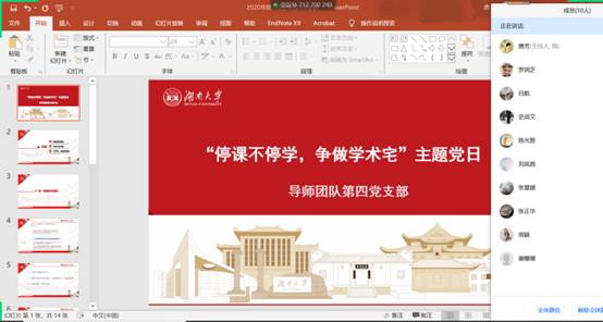 通过此次会议,党员同志们分享了自己居家学习过程中的心得体会并在相互交流沟通中坚定了作为共产党员的担当和使命,在接下来的战“疫”中,导师团队第四党支部全体党员同志也将继续做宅其身、抱道行的“修行者”。