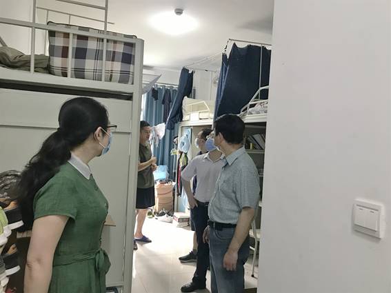 6月15日上午,院党委书记郭平,院党委委员、副院长祝树金,副院长肖皓以及学工办主任李曼、院办主任肖力一行,深入学生宿舍走访看望返校毕业生,并检查指导学院疫情防控工作。