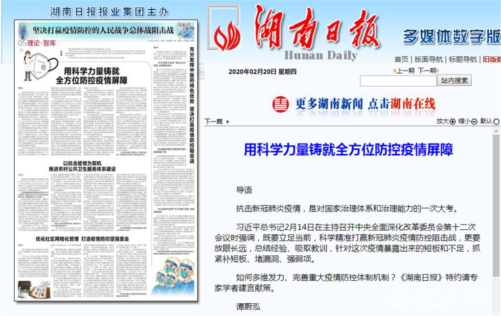 中国科学院院士、湖南省院士咨询与交流促进会会长谭蔚泓教授作为《湖南日报》特约请专家学者提出《用科学力量铸就全方位防控疫情屏障》:一是保持信息公开,二是加强疫情演练,三是保障科研供给,四是注重基础科研与临床实践相结合,五是改革医疗领域人才培养模式。