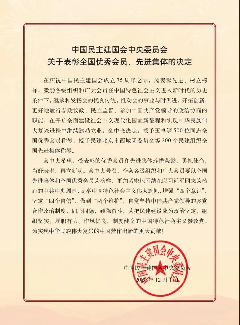 为继承和发扬民建优良传统,弘扬伟大抗疫精神,表彰先进、树立榜样,12月1日下午,民建成立75周年全国优秀会员和先进集体暨抗击新冠肺炎疫情先进个人和先进集体表彰大会在北京隆重举行。民建中央主席郝明金出席表彰大会并讲话。民建中央常务副主席辜胜阻,副主席张少琴、李谠、周汉民、陈文华、孙东生、秦博勇,副主席兼秘书长李世杰出席会议。表彰大会由民建中央副主席高峰主持。