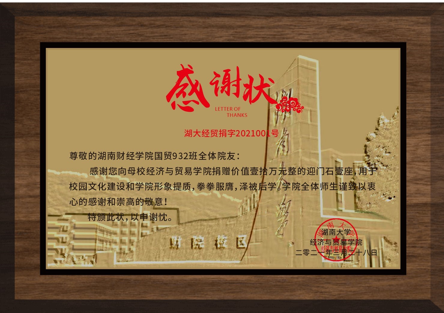 经济与贸易学院”熠熠生辉。捐赠校友代表——湖南财经学院国贸932班院友黄炜、秦峰、邱琼等一行8人代表全班39名校友返校参加仪式。院长侯俊军、党委书记祝树金、副书记李曼、校友工作负责人刘周平、院办主任肖力出席仪式。仪式由校友工作负责人刘周平主持。