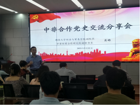 学院副院长、中非经贸合作研究院执行秘书长肖皓以“中非合作党史交流分享会”为主题进行微党课教学,通过丰富的历史文献和图片,生动地再现了中国与非洲建立合作关系的历史进程,全面展示了中非关系的坚不可摧。