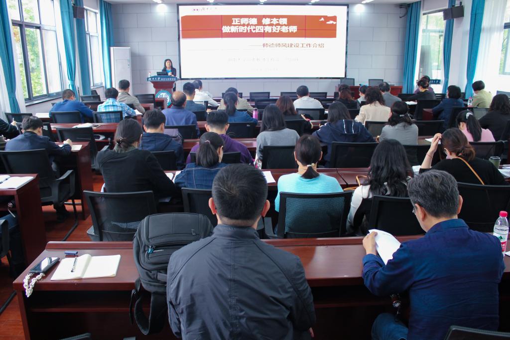 党委教师工作部副部长、副处长鲁阿庆讲述师德师风建设专题报告,会议由院党委书记祝树金主持,学院全体教职员工参加会议。