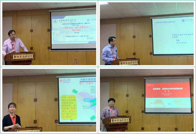 经济与贸易学院经济系系主任艾洪山教授主持、评论。中南财经政法大学工商管理学院院长钱学锋教授分析了全球价值链和制造业服务化对贸易利益的影响,并对贸易利益进行分解以考察不同生产阶段对贸易利益的差异化影响;浙江大学经济学院国际经济学系系主任葛嬴教授论证了中国在全球医疗价值链的位置,分析中国医药产业研发创新水平及存在的问题,最后提出中国在全球医疗产业链的升级与创新的主要路径;西北大学经济管理学院副院长马莉莉教授基于内陆地区参与双循环新发展格局的战略选择,从基于产业生态的定制化开发开放服务、政府层级网络公共治理机制方面提出促进内陆建设开放新高地的政策建议; tasexy