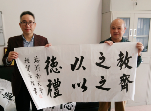 命名九十周年及岳麓书院定名一千零四十周年,特向学院赠送其书写的书法作品。时任院长张亚斌教授代表学院接受了这份珍贵的礼物。