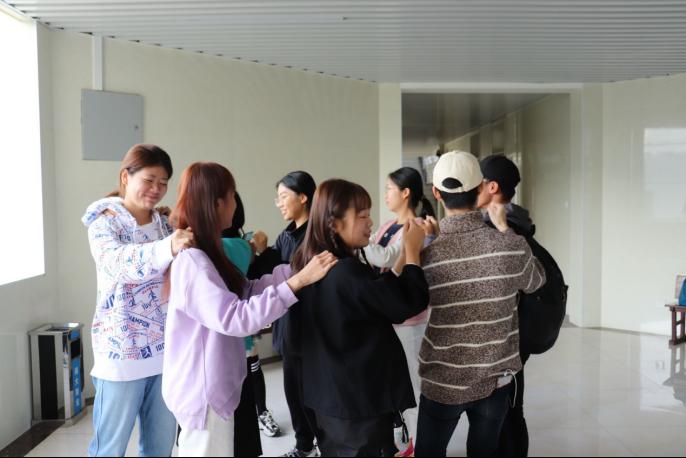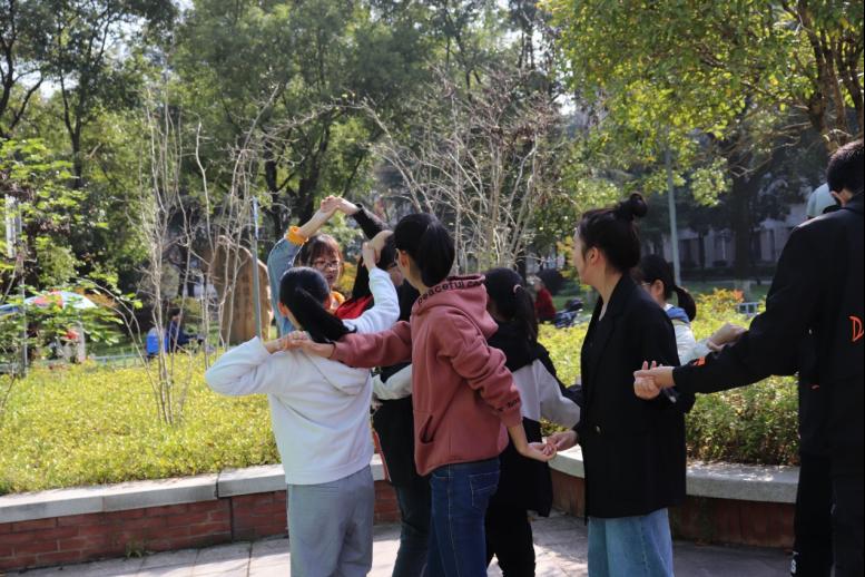 “大圈绕小圈”活动将气氛推向又一个高潮。同学们围大圈而站,双手随机拉成小圈。各小组需在规定时间内解开“小圈”,恢复“大圈”。同学们最初有些不知所措,后来通过摸索懂得了:只有协调、共同努力才能达成目标。同学们再次围圈而站,掌声充斥着整个活动空间,笑容洋溢在每个人的脸上。