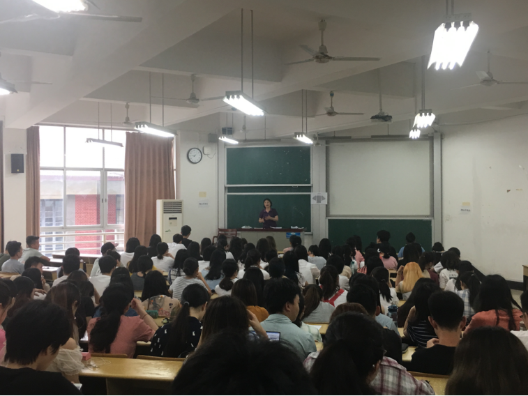 经济与贸易学院2017级辅导员周梦老师在第二教学楼302教室主持召开年级大会,经济与贸易学院2017级全体同学准时入场参加。