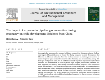 艾洪山教授与谭小清博士合作论文“The impact of exposure to pipeline gas connection during pregnancy on child development: Evidence from China”被资源与环境经济学领域顶级期刊《Journal of Environmental Economics and Management》(JEEM)录用刊出。《Journal of Environmental Economics and Management》在环境经济学领域具有较高的影响因子(IF 5.5),是该领域权威顶级期刊,在经济学界享有良好声誉和广泛认可度,是 tasexy
